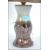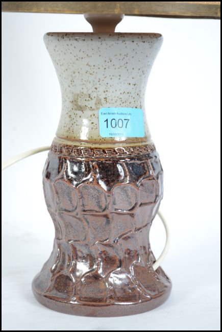 A mid century retro vintage table lamp with an organic heavily textured ceramic base and an original large conical unbleached flax textured shade.