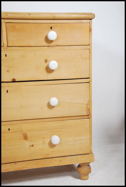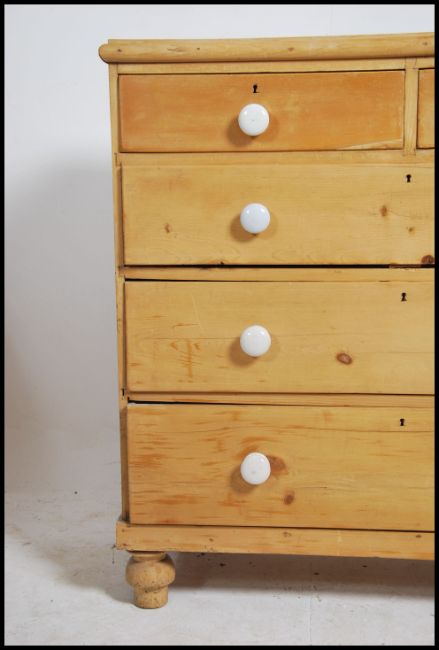 A Victorian pine 2 over 3 country chest of drawers being raised on turned legs with 2 short drawers over 3 deep drawers having white ceramic handles. Flared edge top above. Measures: 103cms  high x 104cms wide x 48cms deep.