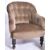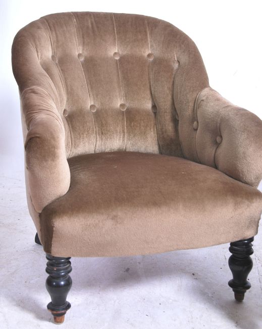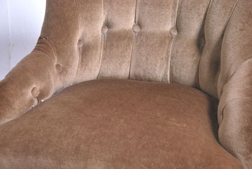 A pair of Victorian style nursing chairs raised on turned legs being upholstered in a beige velour upholstery being button backed. Measures:  69cms high x 56cms wide x 69cms deep.