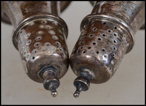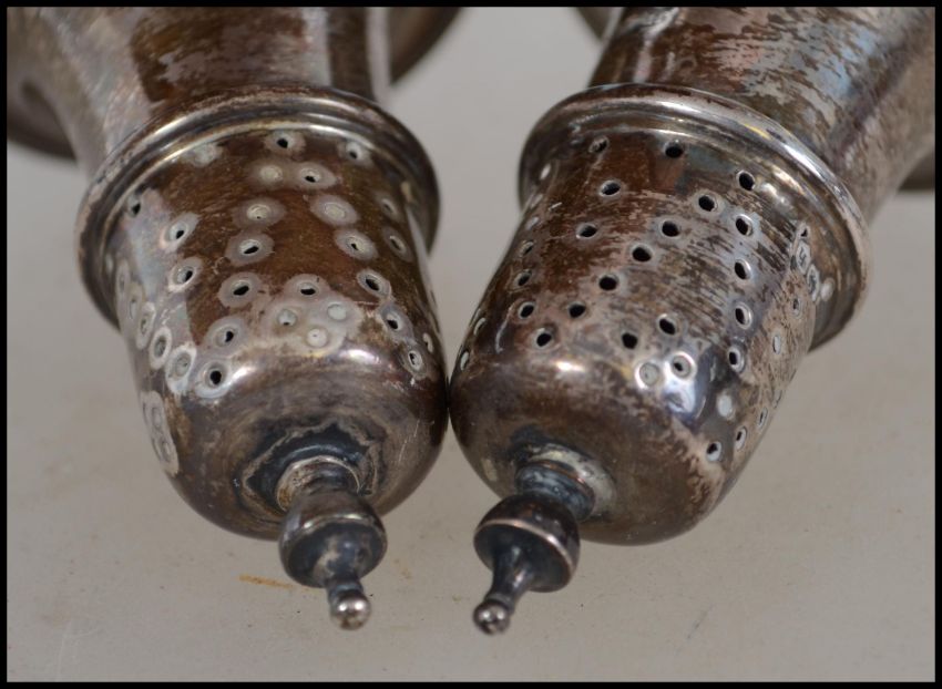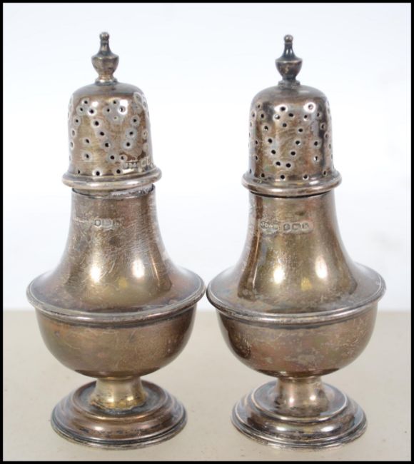 A pair of silver hallmarked salt and pepper pots by James Deakin & Sons of Sheffield, date letter h for 1925. Total weight 78.8g
