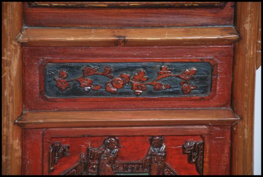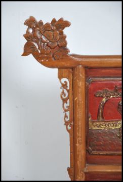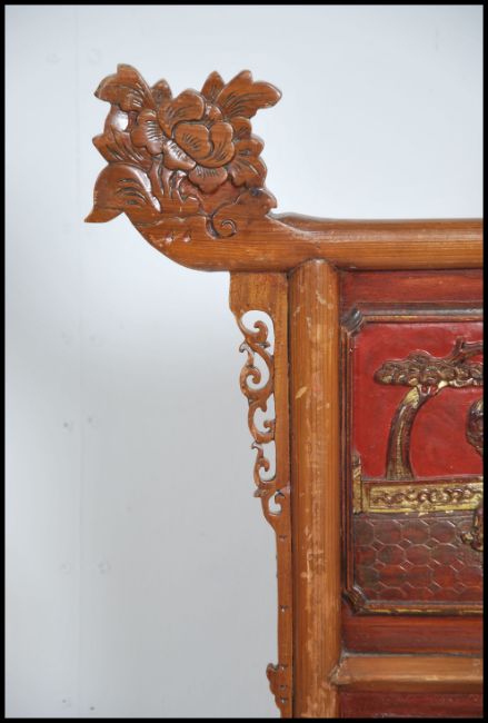 An early 20th century Oriental lacquered pine folding washstand. The top having raised lacquered carved panels depicting musicians, with fret-worked carving top sides with folding washstand position to base