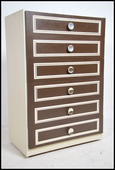 A retro 20th century two tone brown and cream vinyl straight five chest of drawers. Measures: 106cms High x 73cms wide x 44cms deep.