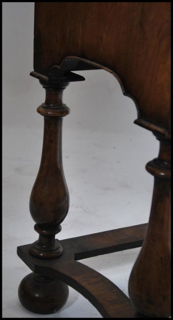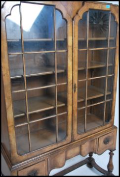 A late 19th century Queen Anne walnut display cabinet on stand. The stunning cabinet with domed top having a moulded arch pediment above a pair of astragal glazed doors housing shelving within. Beneath a series of 3 drawers having serpentine shape and raised on turned legs united by crinoline stretchers. Dismantles into 2 pieces for ease of movement. Measures:  179cms high x 102cms wide x 36cms deep.