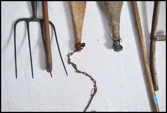 A pair of vintage likely 19th century agricultural interest milk yokes of wooden shaped form complete with chains