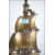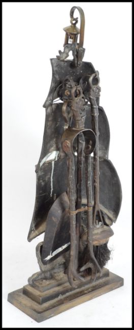 A vintage 20th century heavy brass fireside compendium set in the form of a Viking long boat with full sails. Tools hanging from the verso.