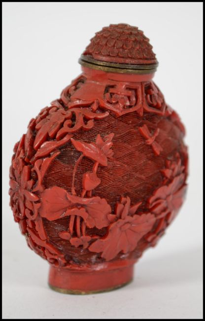 A Chinese red cinnabar lacquer snuff bottle and stopper  decorated with foliate  scenes with character marks to base. Measures 6cm high.
