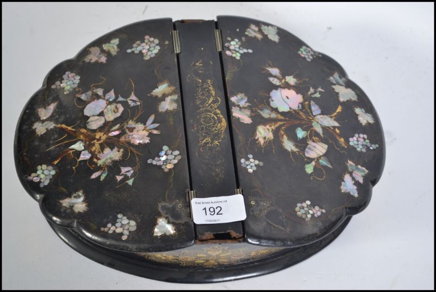 A 19th century oval papier mache work / sewing box, having a double hinged mother of pearl inlaid removable top. The side of the box having hand painted gilt decoration. Measures 30cm wide.