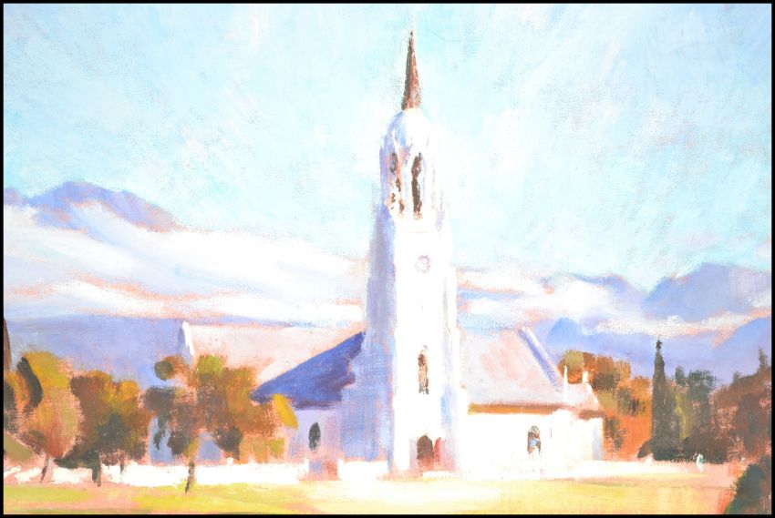 Percy Drake Brookshaw (1907-1993) "Dutch Reform Church" signed and dated '76 inscribed to verso 'Worcester-Cape Province, South Africa' oil on canvas painting and stretched over board NB This artist is more famous for his graphic work including some classic British Rail posters.