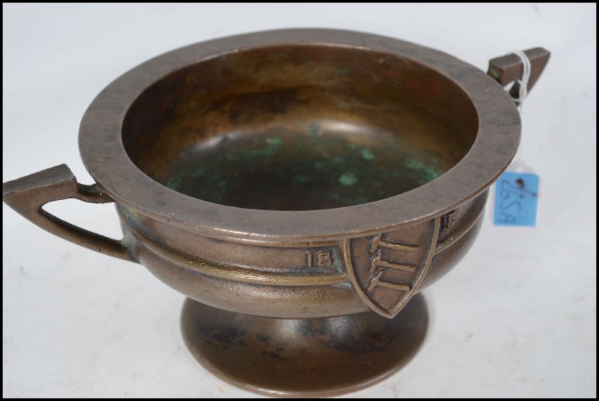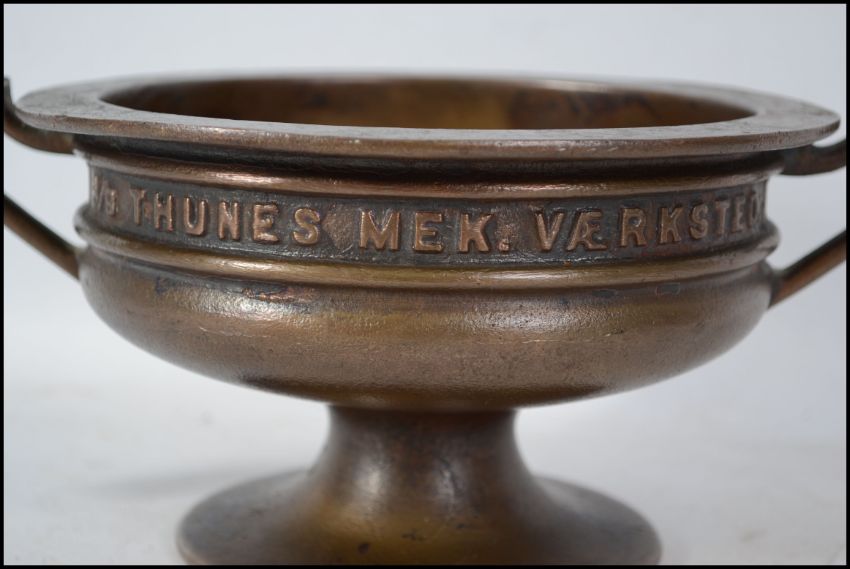 An unusual heavy bronze twin handled bowl raised on terraced foot cast in relief with notation for A/s Thunes Mek. Vaerksted. This company being a Norwegian locomotive company, this dating after their merger in 1969