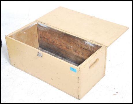 An ebonised vintage early 20th century deed box having a hinged lid and carry handles to the side together with a painted pine box of similar proportions. Measures:  32cms high x 51cms wide x 38cms deep.