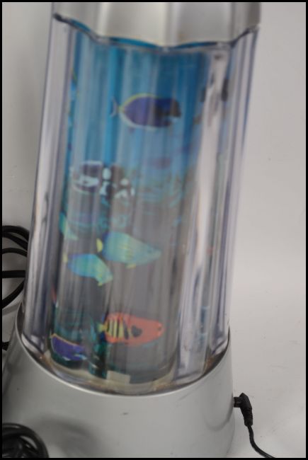 A group of retro 20th century vintage lava lamps two being cylindrical in shape, one being rocket shaped and one depicting fish.