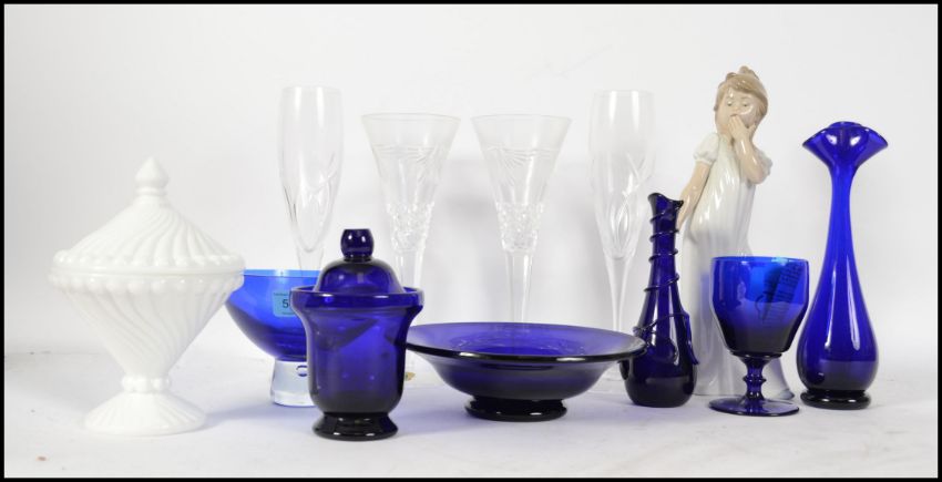 A collection of glass wares to include Bristol blue, Thom Webb, Waterford Crystal etc please see images. Measures:  28cms high tallest.
