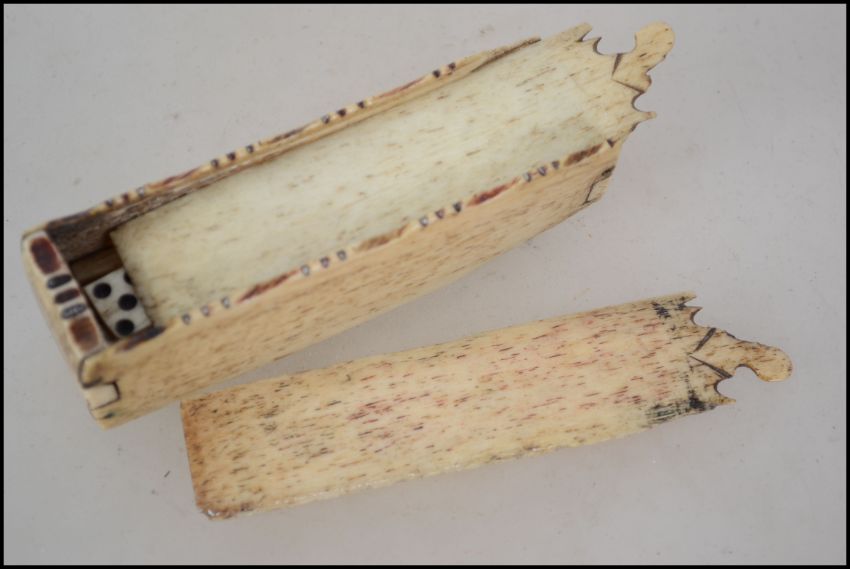 An unusual prisoner of war bone 19th century hand carved domino set complete in the bone case with twin sliding top having dominos set within
