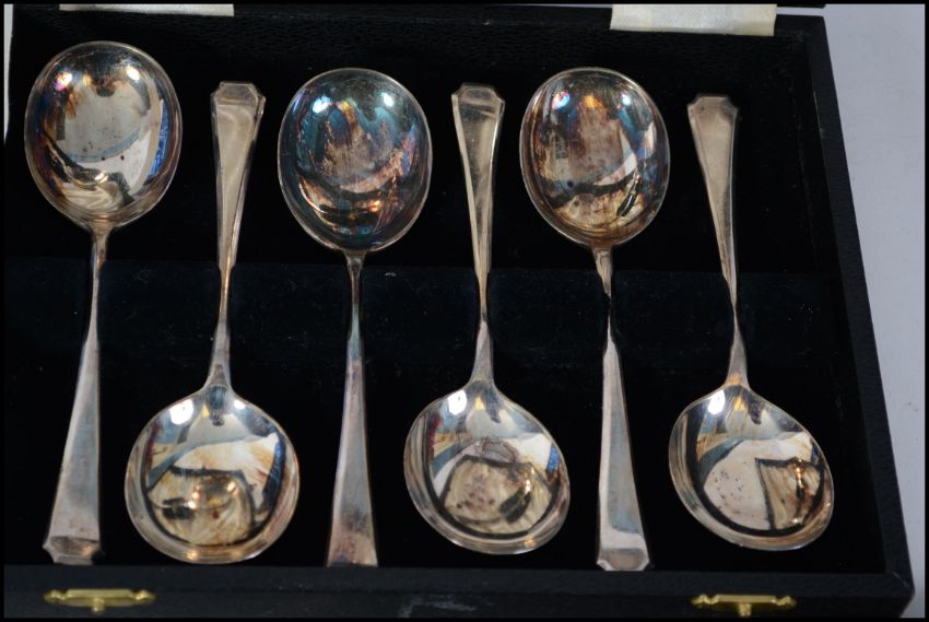 A collection of silver and silver plated wares to include hallmarked silver handled cake knife, silver collar carving set, plated wares to include cased teaspoons etc