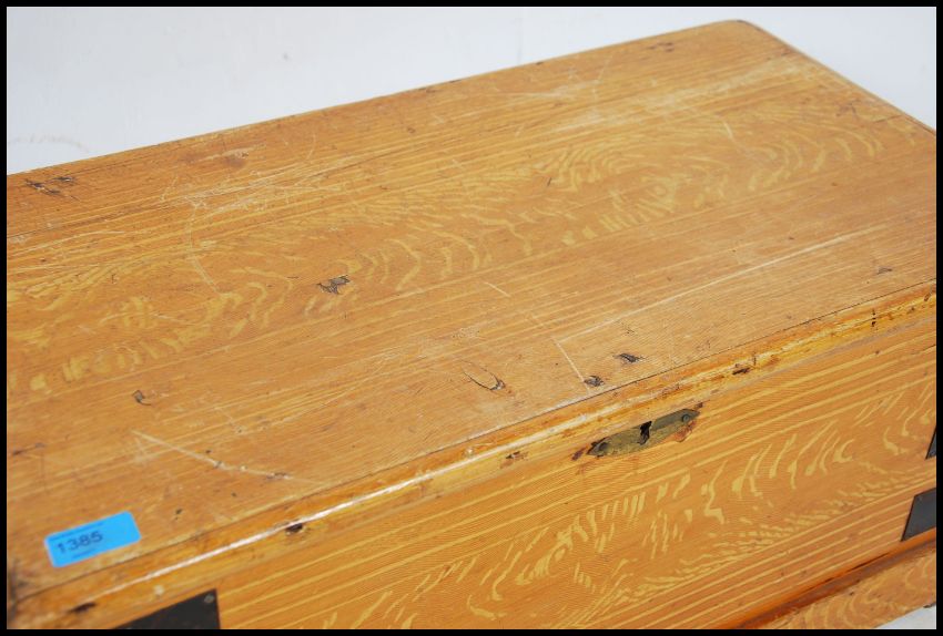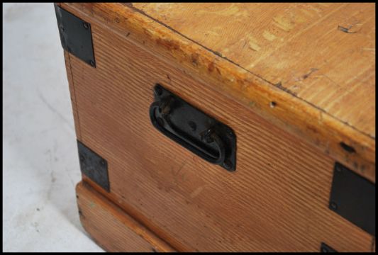 A Victorian scrumble painted pine blanket box chest with ebonised wrought iron bracket work and handles with hinged top above. Measures:  33cms high x 69cms wide x 37cms deep.