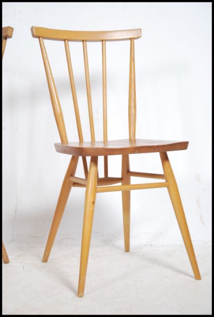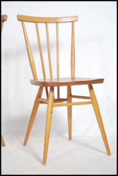 A good pair of 1970's Ercol beech and elm wood dining chairs raised on turned legs with peripheral stretchers  having saddle seats and railed back rests. Measures: 79cms high x 34cms wide x 39cms deep.