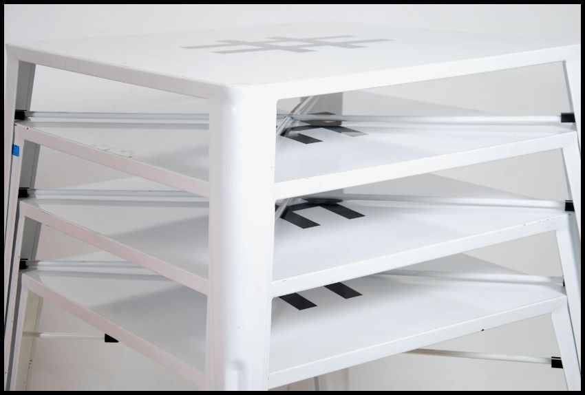 An unusual set of 4 painted metal modernist stacking ' Tolix ' style cafe tables each raised on angular supports with central decoration