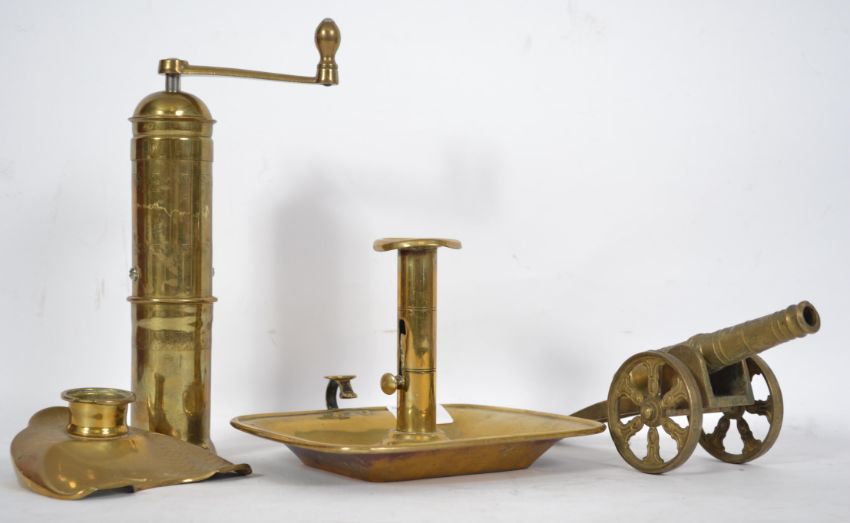 A collection of Victorian and later brass wares to include a night chamberstick, brass desk top cannon, grinder and inkwell
