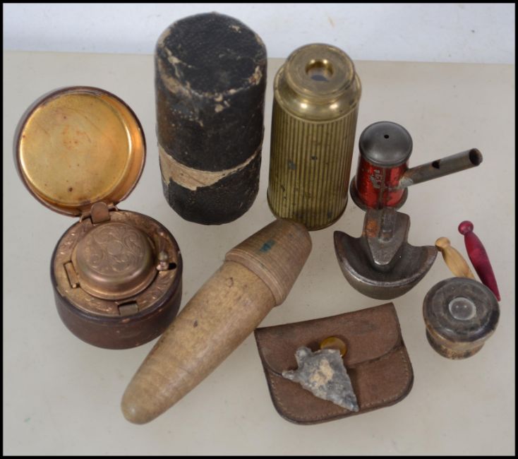 A collection of unusual items to include a treen worked case with articulated wooden worm, small brass extending pocket telescope, Neolithic arrow head, whistle, travelling inkwell, eyepiece etc