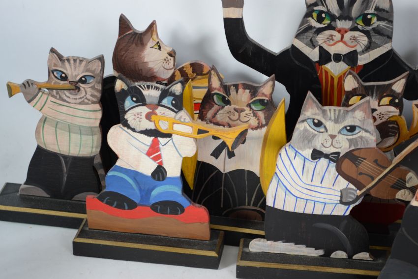 An unusual collection of wooden cats - an orchestra of cats. Each being wooden hand painted panels set over plinth bases with inset musical movements to conductor.