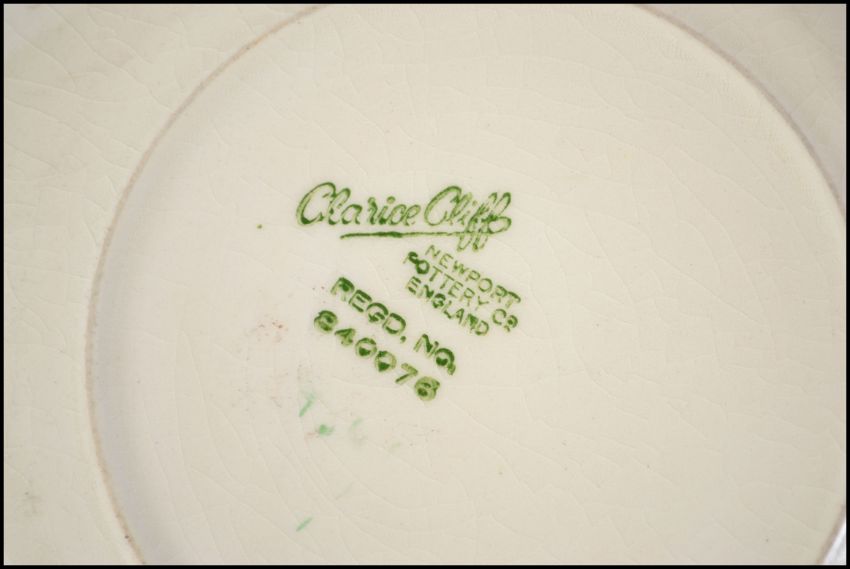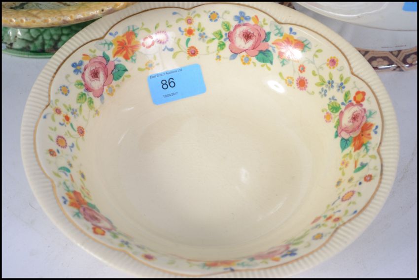 A collection of ceramics to include a Clarice cliff bowl, a majolica dish and a large footed fruit bowl - punch bowl. Measures:  27cms wide.