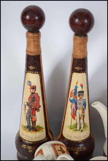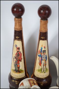 A retro mid century Sadler coffee / tea service in a vibrant pattern to include the teapot, cups, saucers etc. Together with 2 Denby stoneware pots and a pair of leather clad drinks bottles