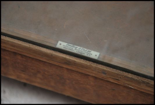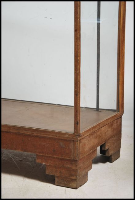 An early 20th century large shop haberdashery display cabinet being raised on square tapered legs with wide glazed body above.