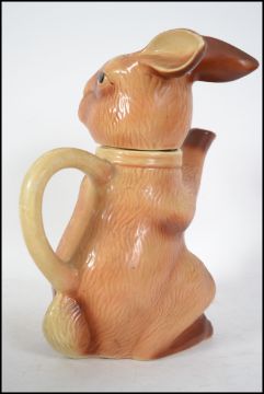 An unusual retro Tony Wood Staffordshire England ceramic teapot in the form of a rabbit being stamped to the base