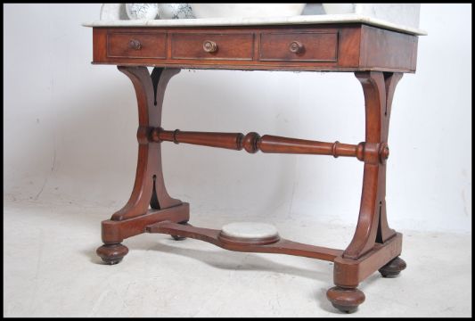 A 19th century Victorian mahogany and white marble washstand by Holland & Sons of Marylebone London. The white veined marble top with gallery splash surround having bowl recess to centre. Set over a mahogany base with faux centre drawers, end drawers opening to reveal notation in ink for Holland & Sons. The column supports united by central stretcher with white marble base. Measures:  105cms high x 92cms wide x 56cms deep.