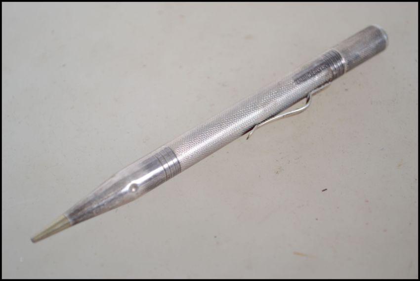 A sterling silver propelling pencil, having an engine turned design and marked sterling silver.