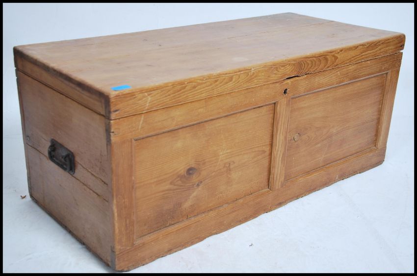An early 20th century oak blanket box chest. Cast ebonised metal handles with hinged top, the rectangular body with fielded panel construction