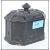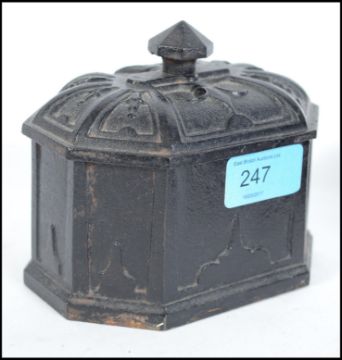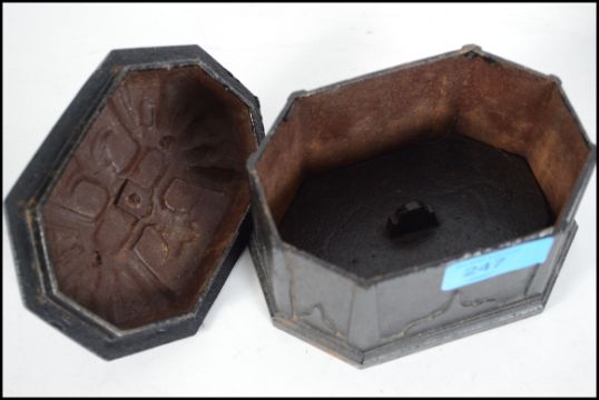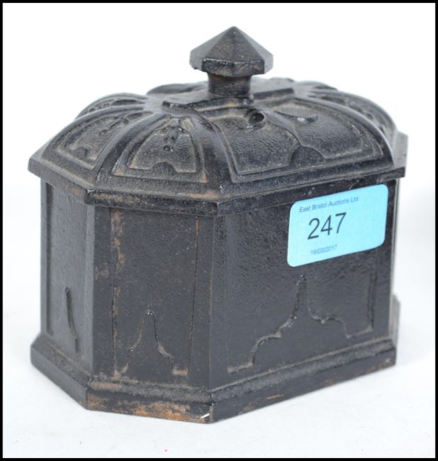 A polished stone urn with inclusive limpet fossils together with a cast iron ebonised tobacco jar having finial lid. The tallest measures 11cm high.