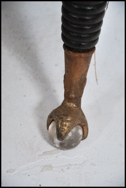 A 19th century apothecary - Industrial chemists table raised on glass ball feet with gilded claw feet on barley twist legs. Finished with a shaped table top above