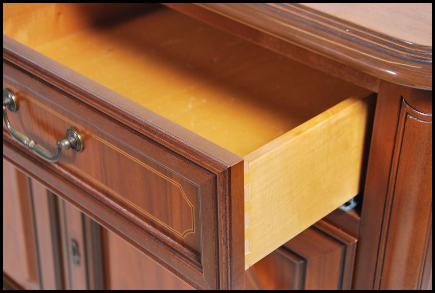 A contemporary mahogany sideboard having a series of drawers and cupboards with drop handles raised on a plinth base.