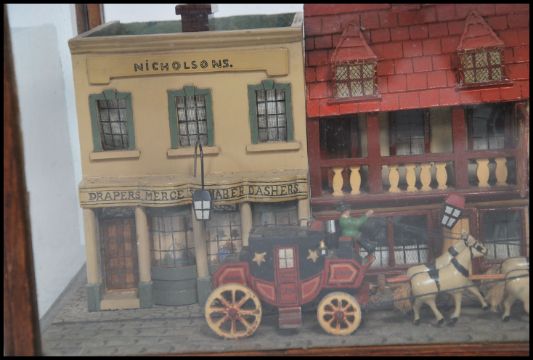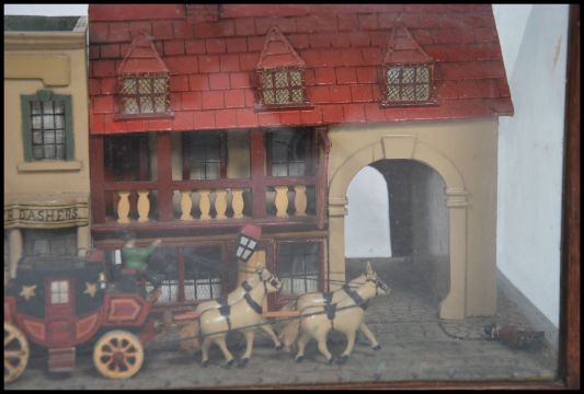 An unusual 20th century glass cased model of a public house / pub with horse and carriage outside. Set within a good glass case. Measures:  35cms high x 48cms wide x 33cms deep.
