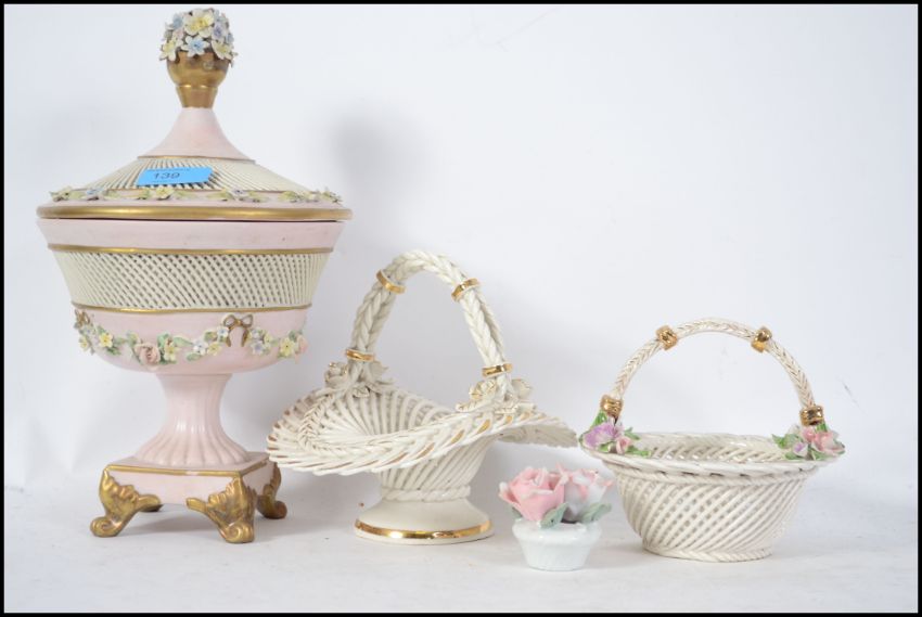 A believed 19th century Meissen type contiental large bon bon dish - taza having pink ground with lattice worked borders raised on gilded terraced base with lid. Together with other bon bon dishes of ribbon form with twist handles etc