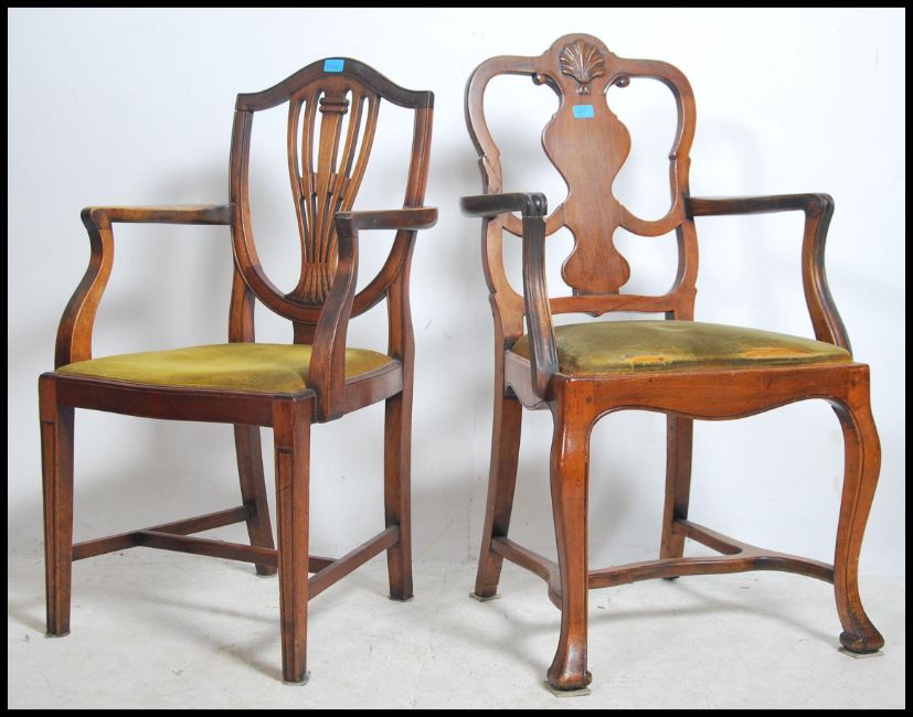 A 19th century Georgian mahogany carver armchair having shell embellished back rest, shaped elbow rests and raised on cabriole legs with pad feet. Together with a 19th century hepplewhite carver armchair. Measures:  100cms high x 53cms wide x 55cms deep.