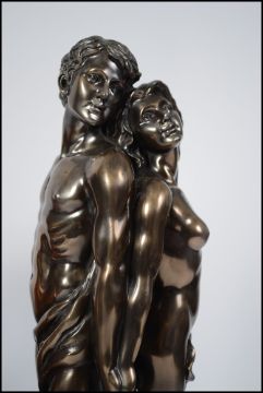 A vintage 20th century hand beaten copper coffee pot with an Asiatic Deity figure together with another figure of a naked couple.