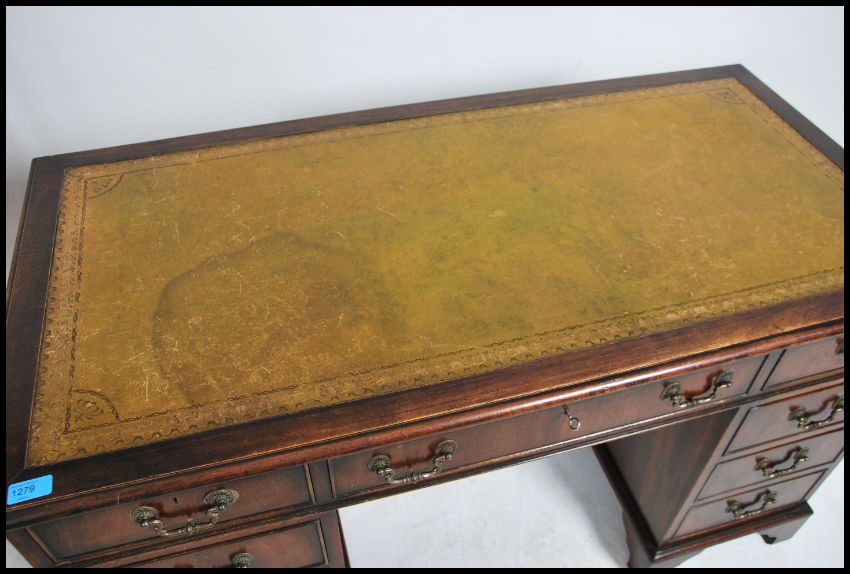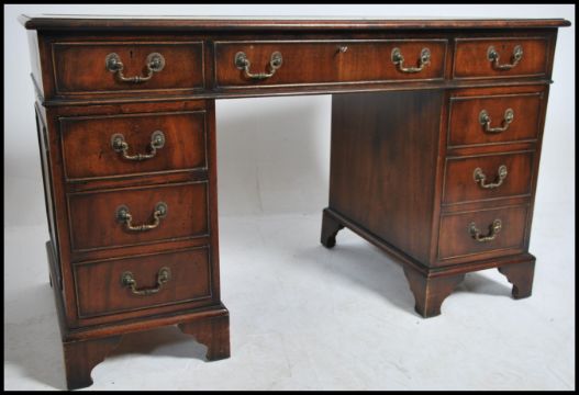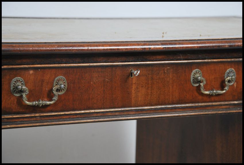 A Georgian style mahogany twin pedestal office writing desk raised on bracket feet with a series of drawers to each pedestal having tooled leather writing skiver atop. Dismantles into 3 pieces for ease of movement.