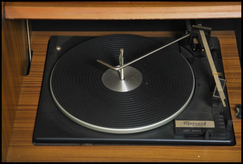 A 1970's retro teak wood gramaphone hi-fi cabinet with hinged top having squared legs and wide body being appointed to the interior. Measures:  65cms high x 132cms wide x 41cms deep.