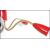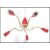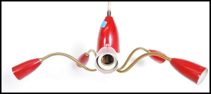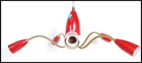 A stunning atomic five point ceiling light fixture having a central conical red rose with five satellite brass branches each with their own conical red shade. Measures:  60cms high x 60cms wide x 60cms deep.