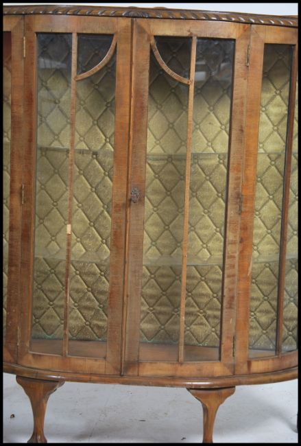 A 1930's walnut Queen Anne revival china display cabinet being raised on cabriole legs with claw and ball feet, glass shelves with original lined back panel. Measures:  119cms high x 117cms wide.