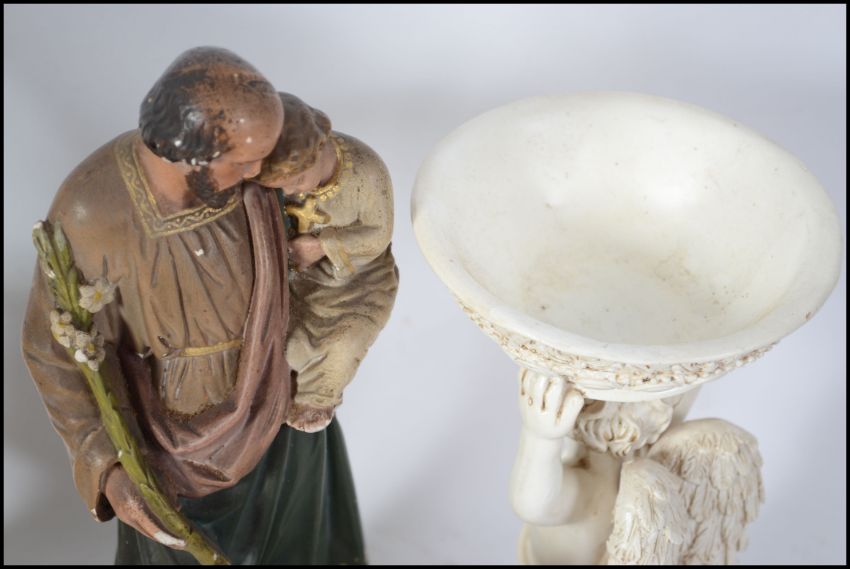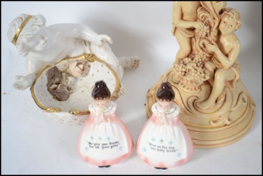 A collection of ceramic figurines to include cherub putti table salt, tall centrepiece, figurine of a scholar, ceramic figurines - souvenir ware. Measures: 31cms high.