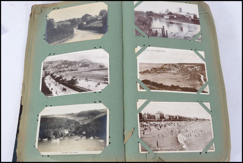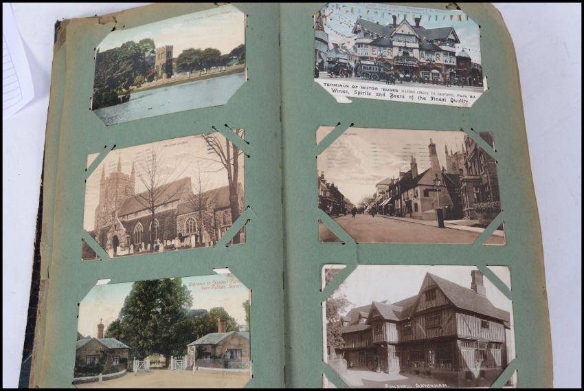 A good faux snakeskin postcard album containing many topographical view to include Bognor, Brixton, Dulwich, Herne Hill, Falmer, Lavenham, Hailsham, Croydon, Brentdford, Earls Court, Ilfracombe, Sidmouth, Ipswich, Devon, Llandudno and many others