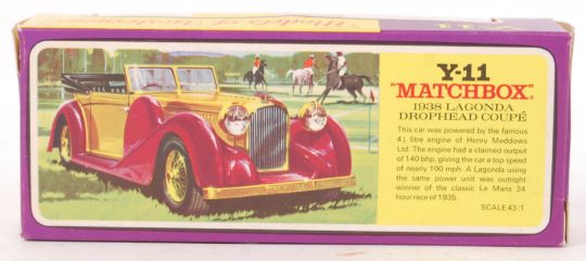 An original vintage Matchbox Lesney 1938 Lagonda Drophead Coupe Y-11. Gold & maroon coloured. Within its original box.