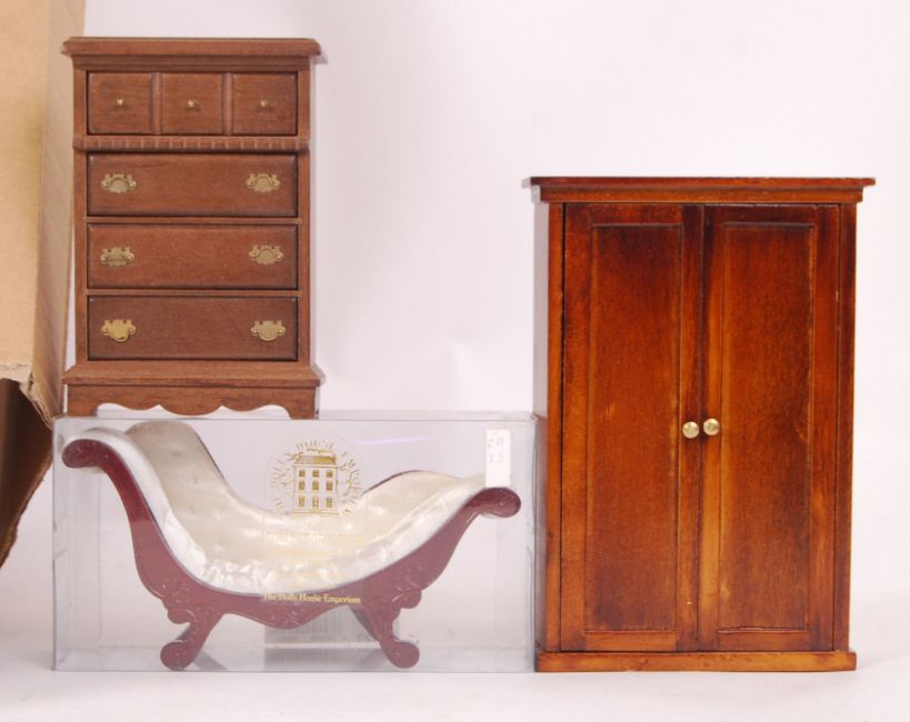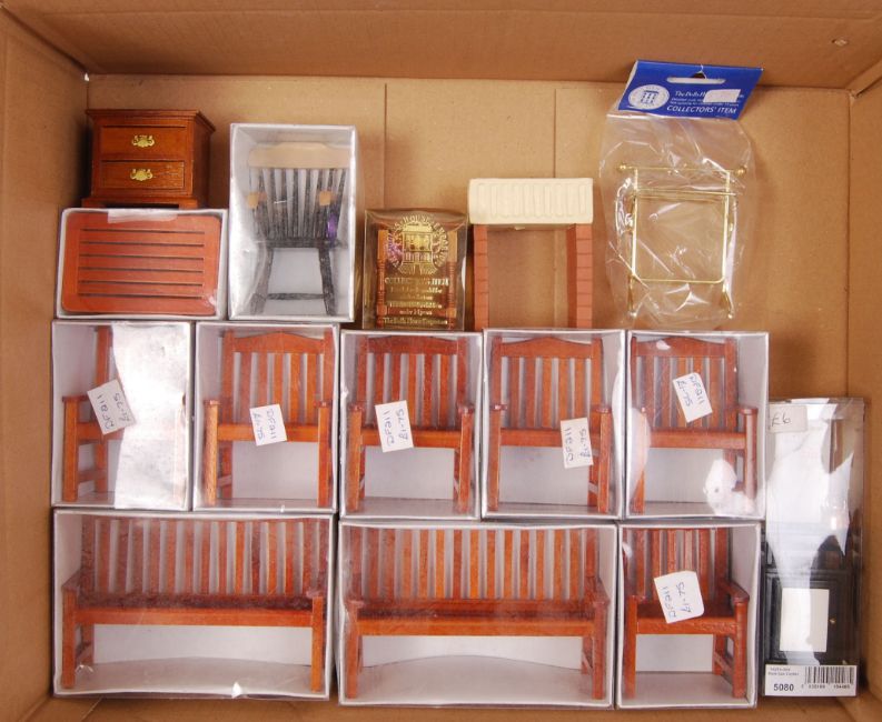 A large collection of mostly dolls house garden furniture & seating to include; towel rack, benches, seats, sofas, side tables etc. Mostly within original packaging.