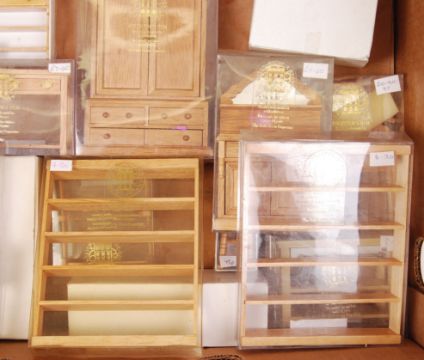 A large collection of original detailed scale model light wood coloured dolls house furniture by Dolls House Emporium to include; cabinets, stalls, wardrobes etc.