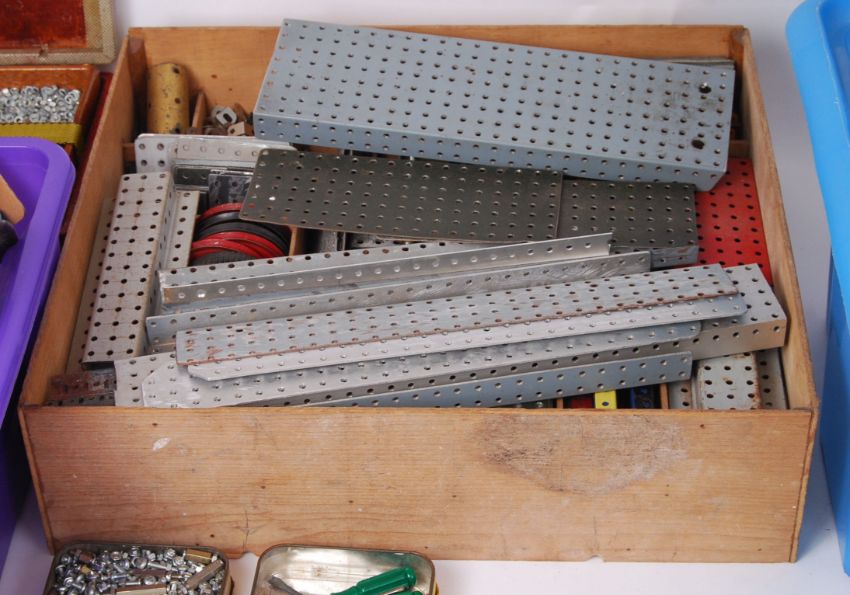 A large collection of original vintage Meccano to include; black & silver straights, red and blue squares, tubs of washers & screws, wheels etc. Also to include a large built Meccano crane.