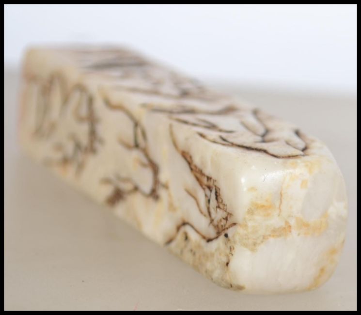 A Chinese cream and grey soapstone seal 19th/20th Century of rectangular form, well carved with trees and houses within a mountain landscape and several resting on cliff edges.  It has four carved characters to base. Measures 10cm high