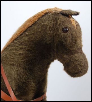 A 20th century Hadden style trestle rocking horse raised on a pine glider the body of the horse having a faux pelt covering. Measures 100cm high x 142cm wide x 53cm deep.